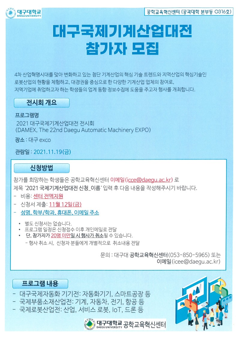 문의 : 대구대 공학교육혁신센터(053-850-5965) 또는 이메일(icee@daegu.ac.kr)