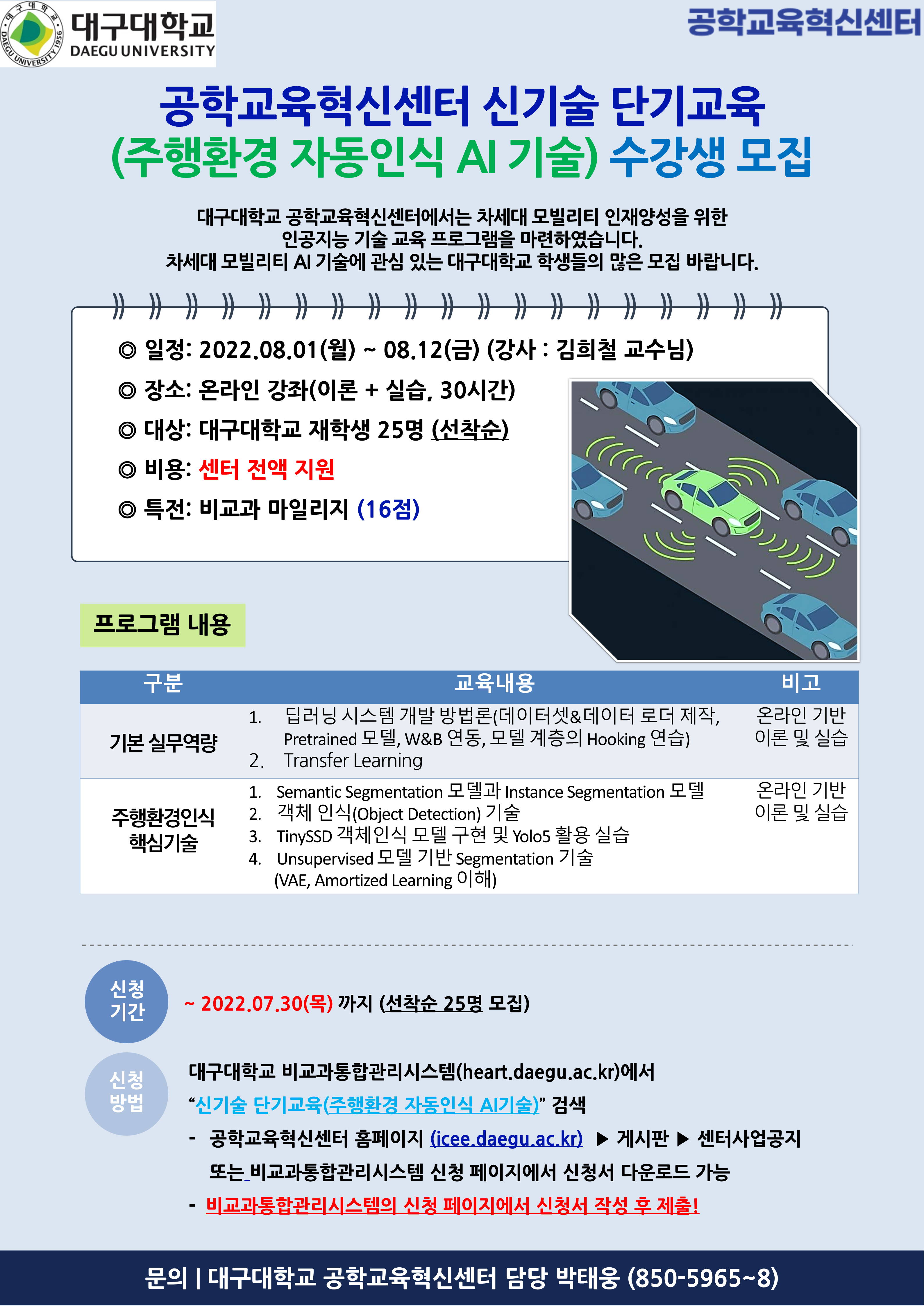 본 교육 프로그램은 미래 유망 산업인 차세대 모빌리티 분야의 지역 산업계 AI 개발자의 저변 확대를 위한 목적으로 마련되었습니다. 많은 참여 부탁드립니다.