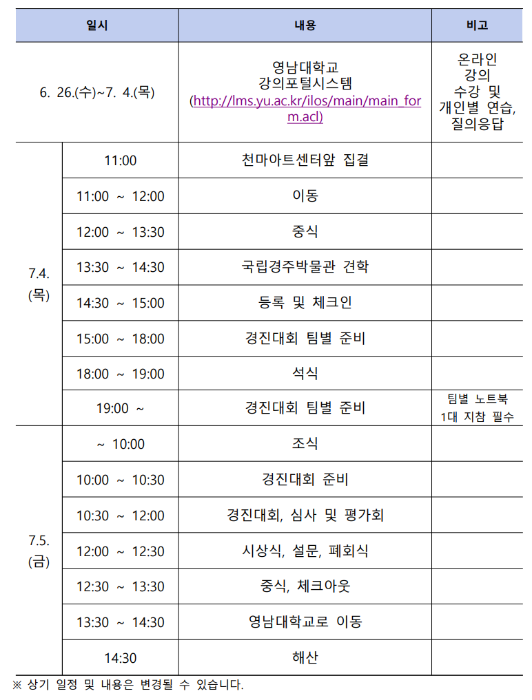 다가오는 7월 첫째 주에 영남대학교와 함께하는 인문융합캠프가 예정되어 있습니다. 자세한 일정은 아래와 같습니다.