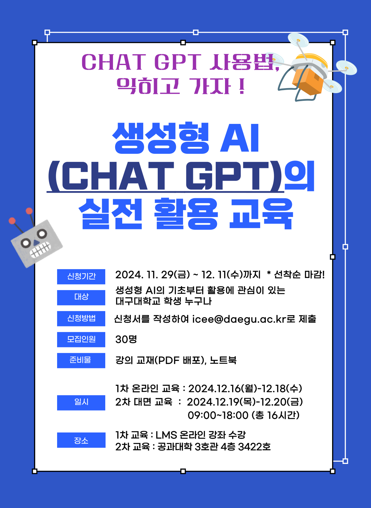 생성형 AI의 실전 활용 교육이 예정되어 있습니다. 텍스트, 이미지, 영상, 웹사이트 제작에 이르는 다양한 생성형 AI 도구 활용법을 체계적으로 학습하며 실습 중심으로 설계되었습니다. AI 기술의 실질적 활용에 관심있는 학생분둘의 많은 참여부탁드립니다.